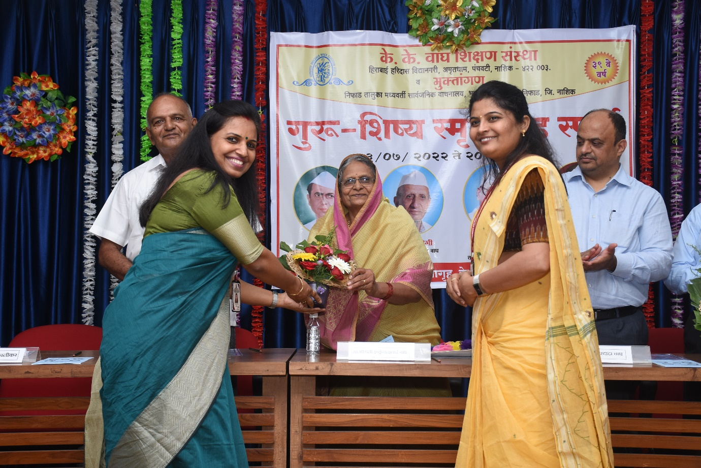 Welcoming Hon. Chairman Shri. Sameer B. Wagh, Smt. Shakuntalatai B. Wagh, Shri. Shivaji K. Nathe by Mrs. Amrit A. Rao and Mrs. Ashwini S. Pawar.