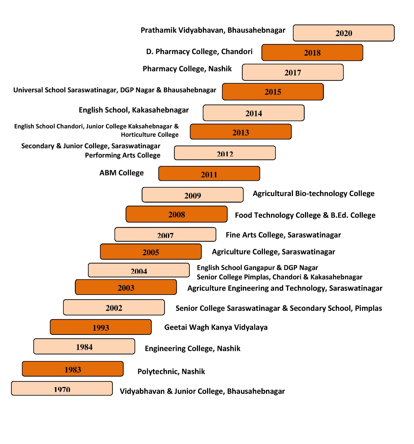 This humble beginning has over the years, under his leadership, grown to 35 institutes. His vision was that a girl who has entered the first standard in a school should not stop her educational pursuit just because there is no facility nearby. She should rather continue being a graduate, postgraduate or research scholar with a Ph.D. Thus, there is the scope of going from KG to Ph.D. here. Gradually one step at a time, the campuses of K.K Wagh Education Society span over 9 sites and cover a range of special subjects catering to the needs of changing times. He believed that education should not only provide means of livelihood for a person but it should also satisfy the needs of society.